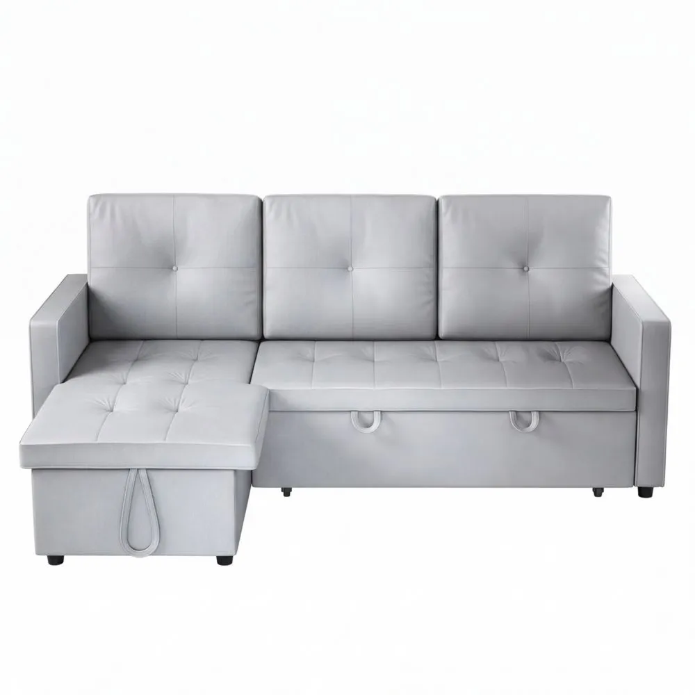 Ecksofa mit Schlaffunktion und Bettkasten, 3-Sitzer, Katzenpfotenleder, Hellgrau