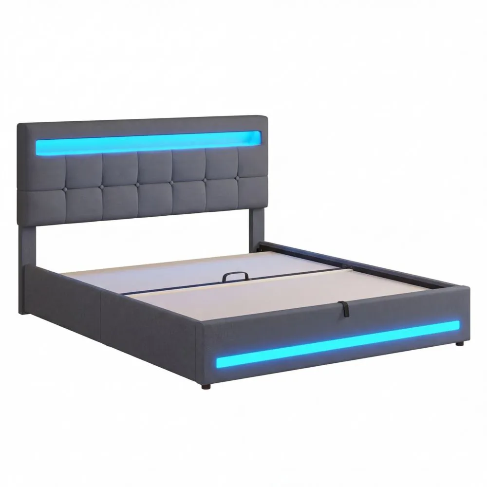 Das Kopfteil des Bettes ist höhenverstellbar und bietet USB- und Type-C-Anschlüsse zum Laden von Geräten. Unter dem Bett befindet sich ein Stauraum, der einfach durch die hydraulische Hubfunktion zugänglich ist. LED-Lichtleisten befinden sich am Kopf- und Fußende und können in Farbe und Helligkeit individuell eingestellt werden. Der stabile Rahmen mit Holzlattenrost sorgt für Stabilität und eine Tragfähigkeit von bis zu 250 kg. Geräuschdämpfende Streifen minimieren Reibungsgeräusche.