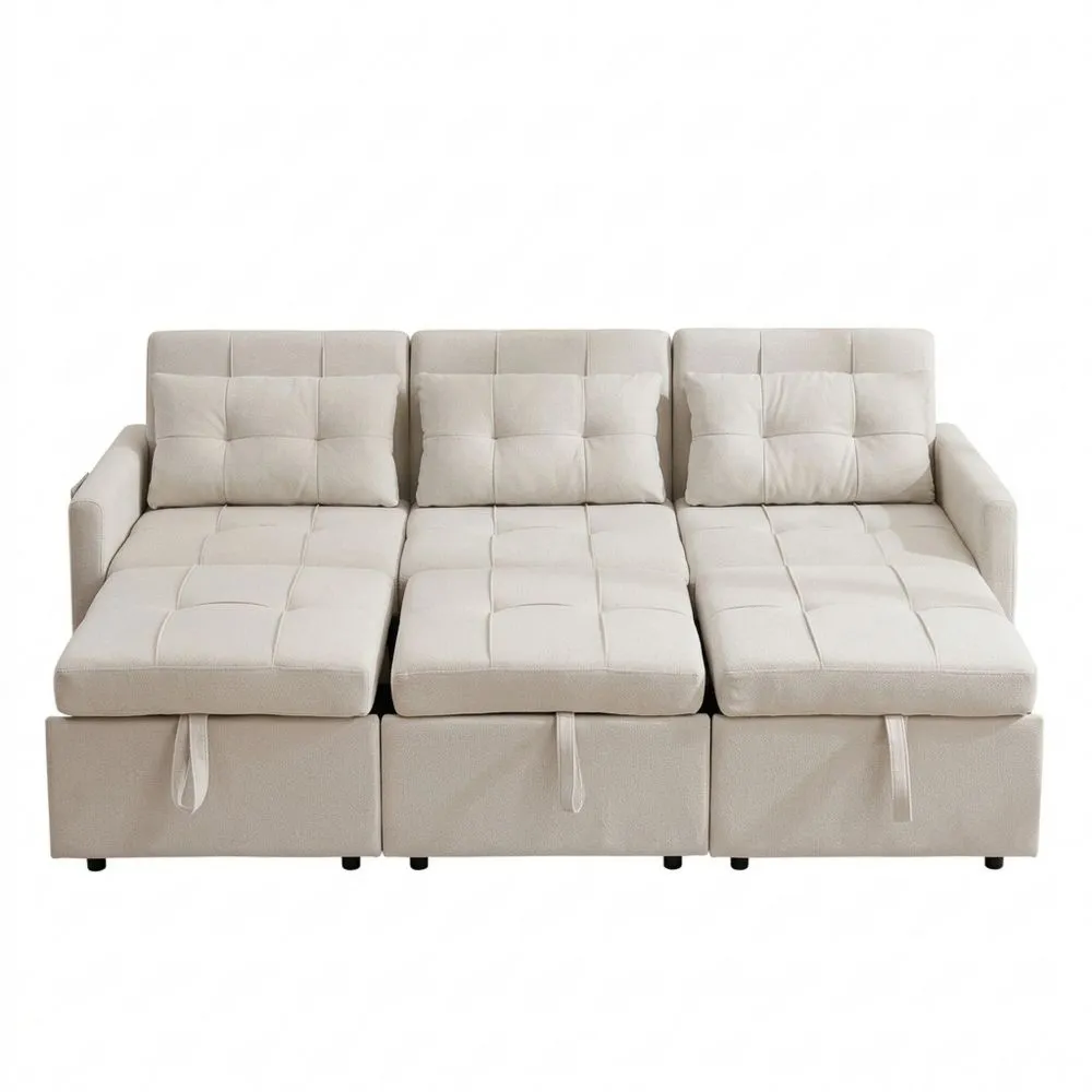 Technische Daten: Maße (aufgebaut): 200 x 87 x 84.5 cm (LxBxH), Sitzplätze: 3, Material: Bezug aus Vliesstoff, Farbe: Beige, Max. Belastung: 200 kg, Besonderheiten: Verschiedene Konfigurationen, verstellbare Rückenlehne, Seitentaschen.