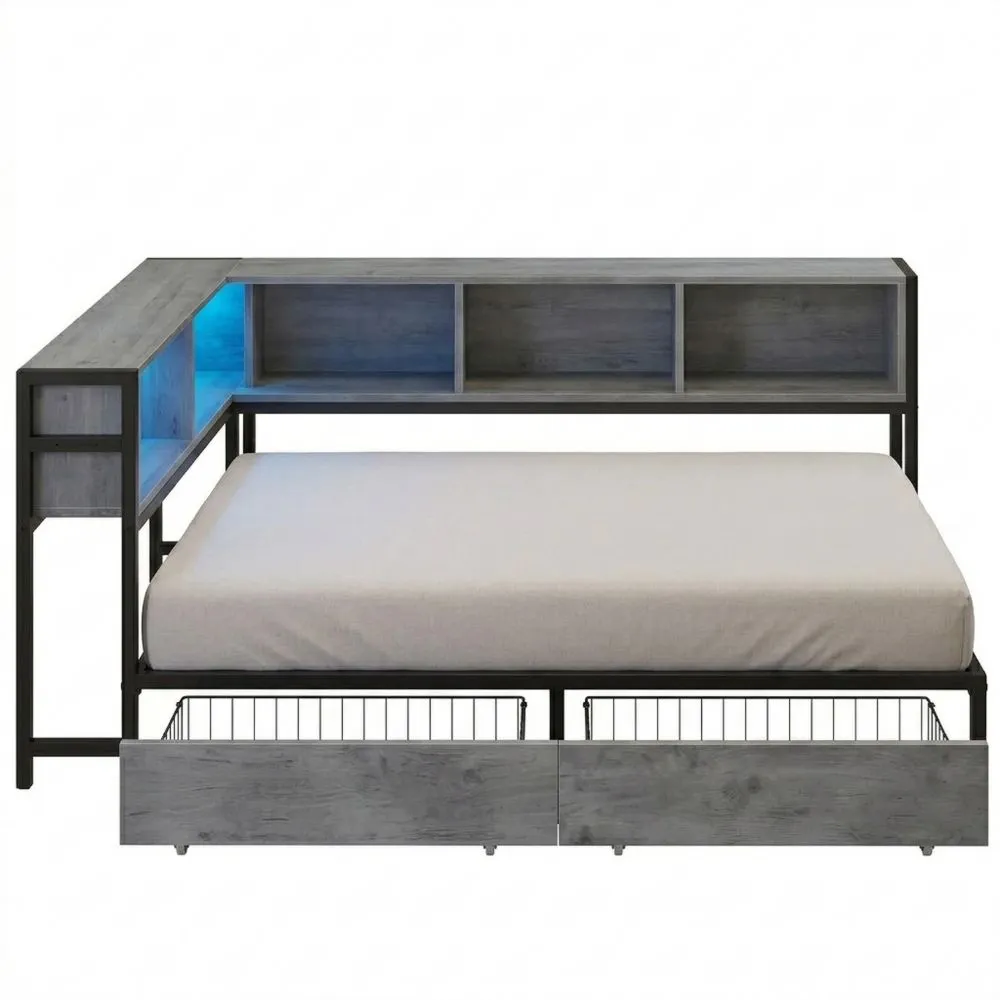 Dieses Schlafsofa bietet eine praktische Lösung für kleine Räume. Es fügt sich mit seinem L-Design mühelos in Ecken ein. Zwei Aufbauvarianten ermöglichen eine Anpassung an individuelle Bedürfnisse. Tagsüber dient es als Lounge-Sofa, nachts als Einzelbett mit den Maßen 90 x 200 cm. Es ist für verschiedene Wohnräume geeignet. Das Kopfteil enthält Stromanschlüsse wie AC-Steckdosen und USB-Anschlüsse, um elektronische Geräte bequem aufzuladen. Eine LED-Beleuchtung bietet verschiedene Einstellungen wie Helligkeit und Farbe, die per App steuerbar sind. Die Beleuchtung kann auch Musik synchronisiert werden. Das Bett ist mit Stauraum ausgestattet, um den vorhandenen Platz effektiv zu nutzen. Es beinhaltet Fächer im Kopfteil zum Organisieren von Alltagsgegenständen. Zusätzlich ist es mit zwei großen belüfteten Schubladen ausgestattet, die sich geräuschlos bewegen lassen. Mit ausreichend Platz unter dem Bett können größere Gegenstände verstaut werden. Dank transparenter Schutzecken und einer stabilen Konstruktion ist das Bett sicher für den täglichen Gebrauch geeignet. Die Montage ist durch nummerierte Teile erleichtert.