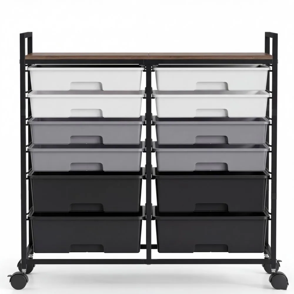 Der Rollcontainer mit 12 Schubladen bietet praktische Aufbewahrungsmöglichkeiten für verschiedene Räume. Die holzoptische Arbeitsplatte dient als stabile Oberfläche für diverse Gegenstände. Mit Abmessungen von 76,7 cm Länge, 31,6 cm Breite und 77 cm Höhe ist er raumsparend einsetzbar. Die farbigen Kunststoffschubladen erleichtern die Organisation. Der Container ist mit 360-Grad-Rädern ausgestattet, die eine flexible Bewegung ermöglichen. Der robuste Rahmen gewährleistet eine stabile Konstruktion.
